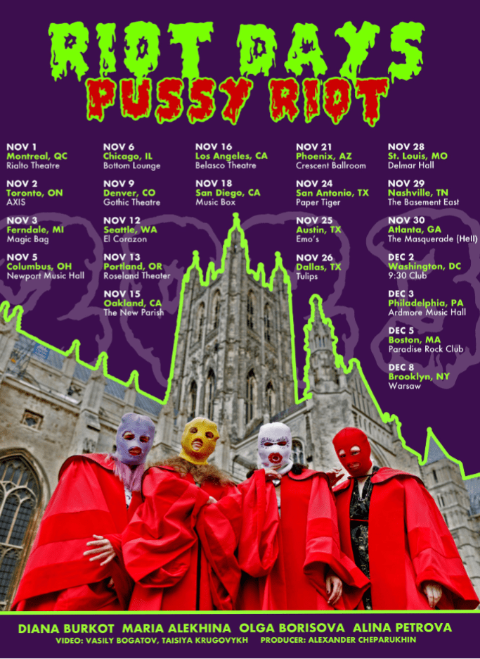Pussy Riot just started their US tour and this is a description of what their performance is: “Riot Days is a play based on the memoir of Pussy Riot’s Maria Alyokhina. It’s a story of resistance, repression and revolution in a mixture of concert, rally, theatre and political happening.”